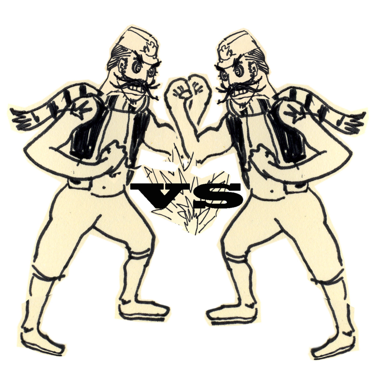 Round 3 | Mounting bicycles and still holding their spears, the brothers begin to ride at each other like a medieval joust. They crash horrifically but are unharmed and undeterred. Both men then leap to their feet and square off in an old school bare-knuckle boxing match. The two are of equal strength and vulnerability. Each punch landed is more devastating then the last and makes the receiver’s head distort horrifically. After several hits by both brothers, the fight descends into a wrestling match on the floor. In the end, we leave the twins hemorrhaging on the ground biting one another’s ankles.